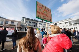 Rund 200 Menschen haben unter dem Motto „Westerburg steht auf“ die Stimme erhoben. Auf dem Platz vor der Stadthalle demonstrierten sie mit bunten Plakaten für Werte wie Demokratie und Menschenwürde.